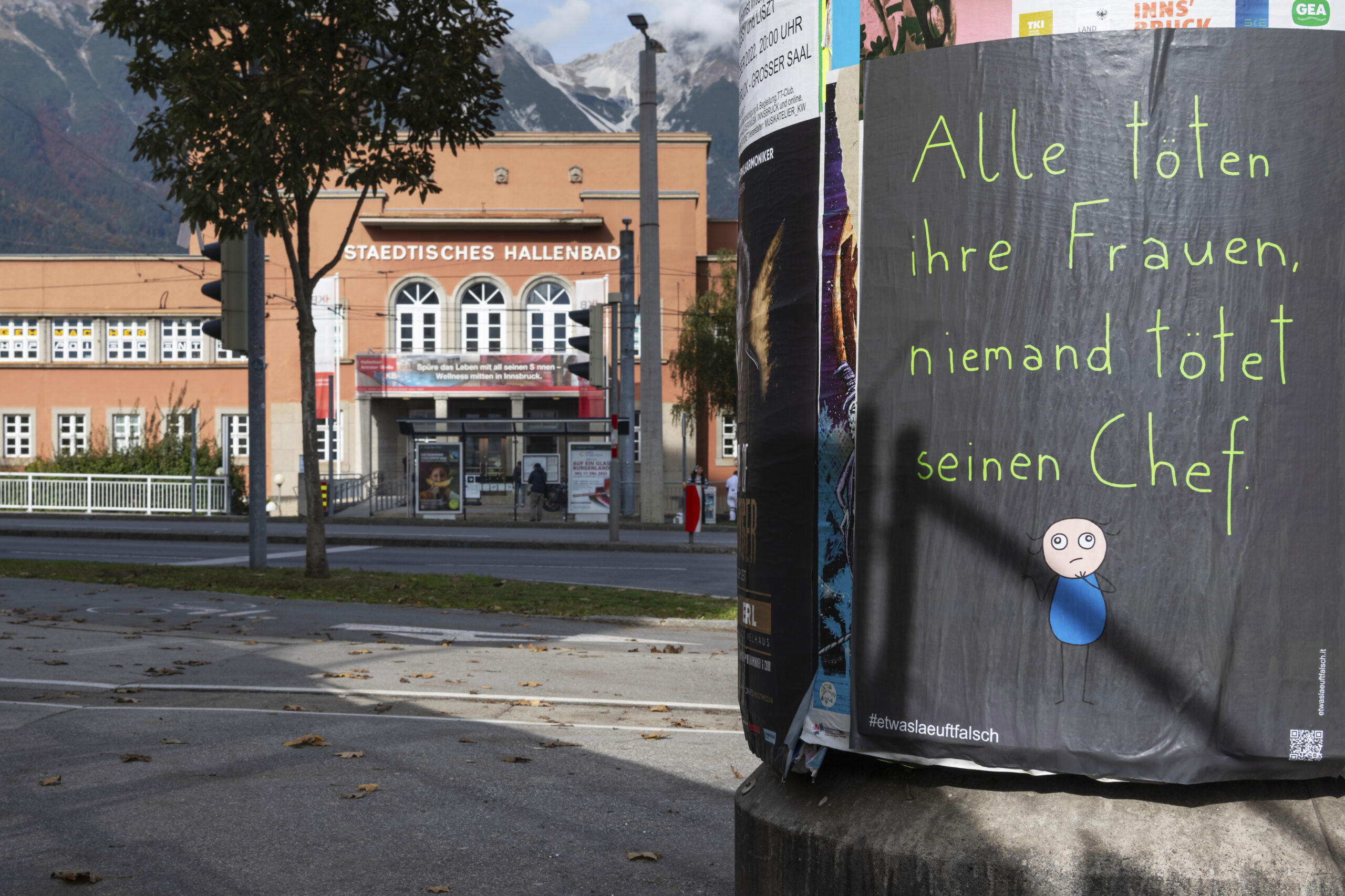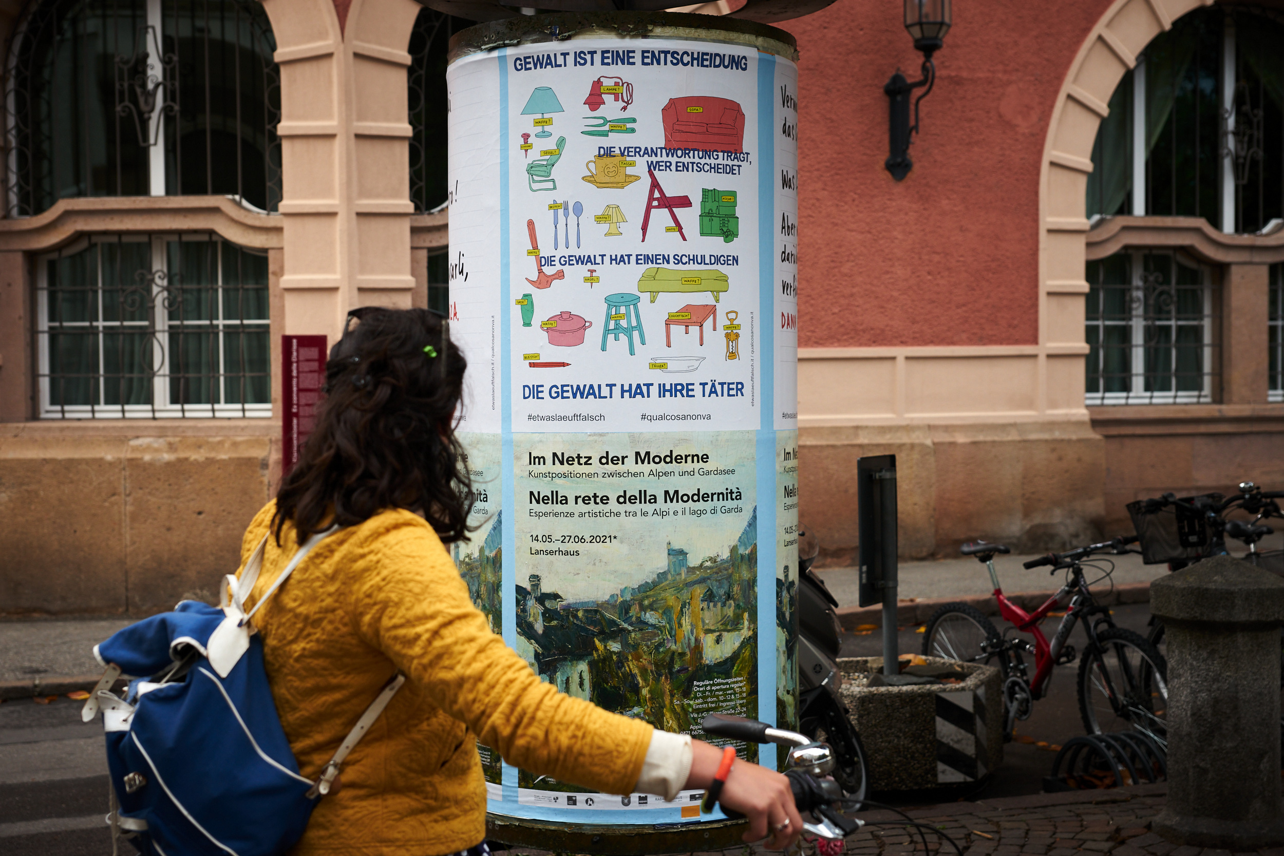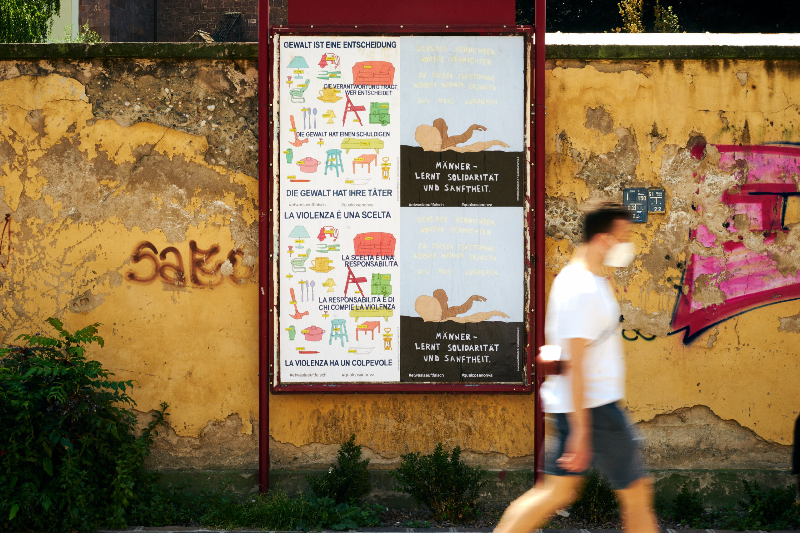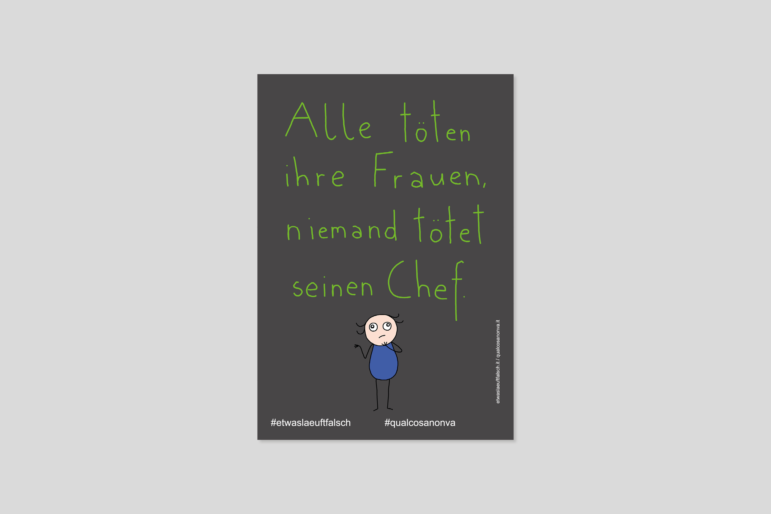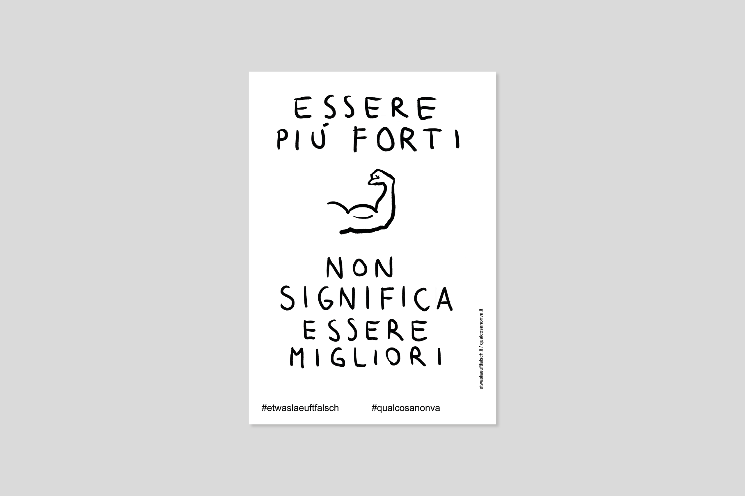 La serie di manifesti “In your face” affronta i rapporti di forza con cui ci confrontiamo ogni giorno: il genere e i muscoli. I disegni e i fumetti scritti a mano hanno un impatto immediato e provocatorio e fanno sorgere domande su cosa significhi essere forti e se il genere possa giustificare la violenza. I manifesti si interrogano sul senso della parola ‘forza’ e in che modo vada di pari passo con la responsabilità. In quali occasioni ci definiamo in base al nostro genere e quando esso diventa uno strumento di potere? Come vogliamo usare la nostra forza? E ancora: in quali situazioni crediamo di dover essere forti?