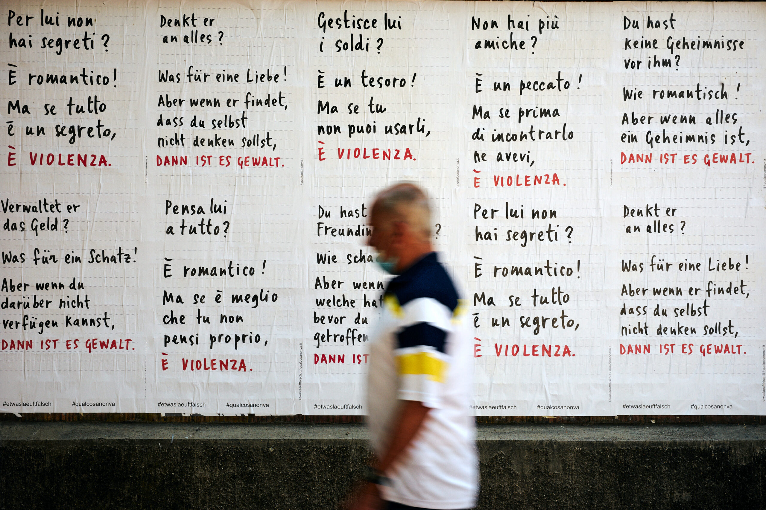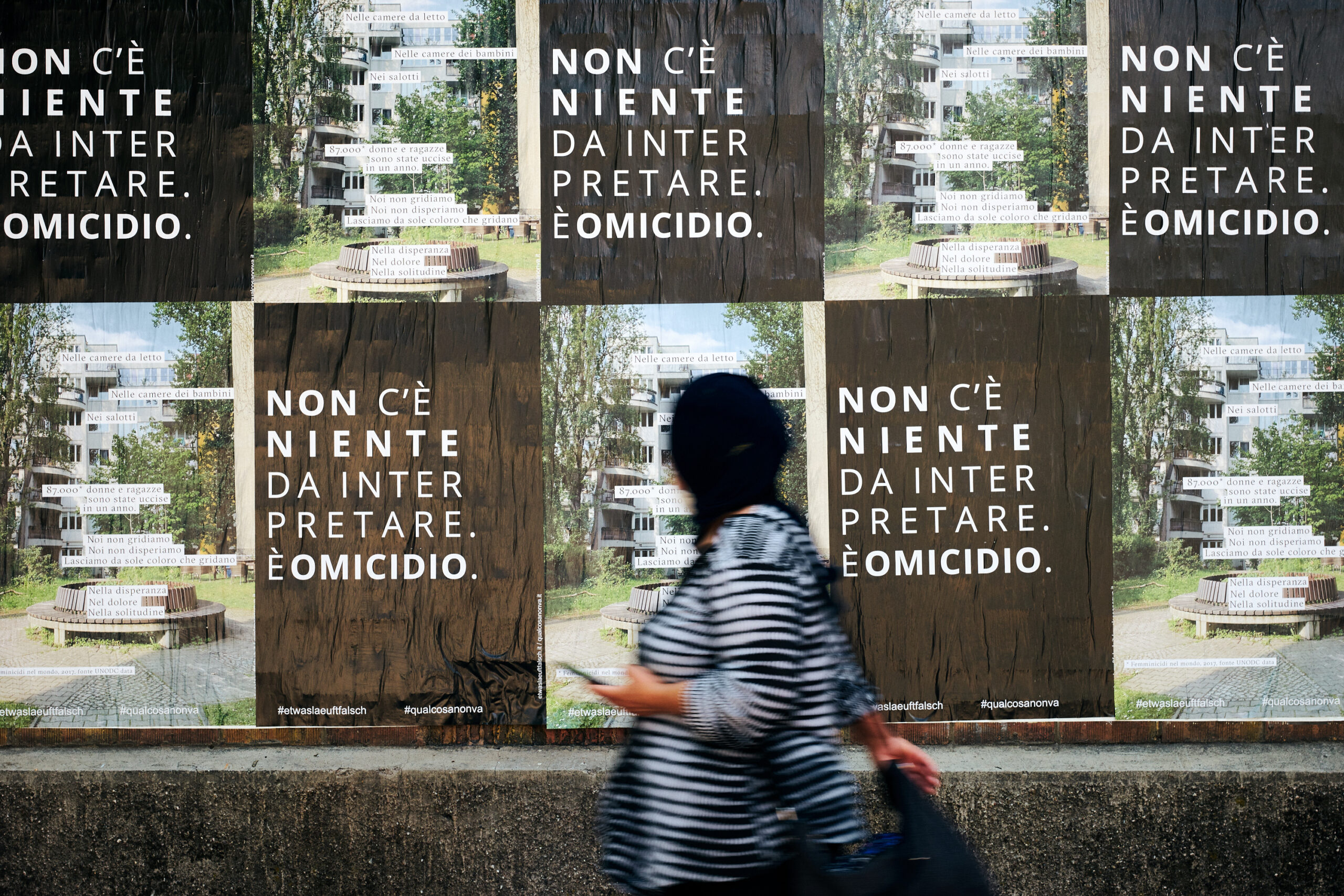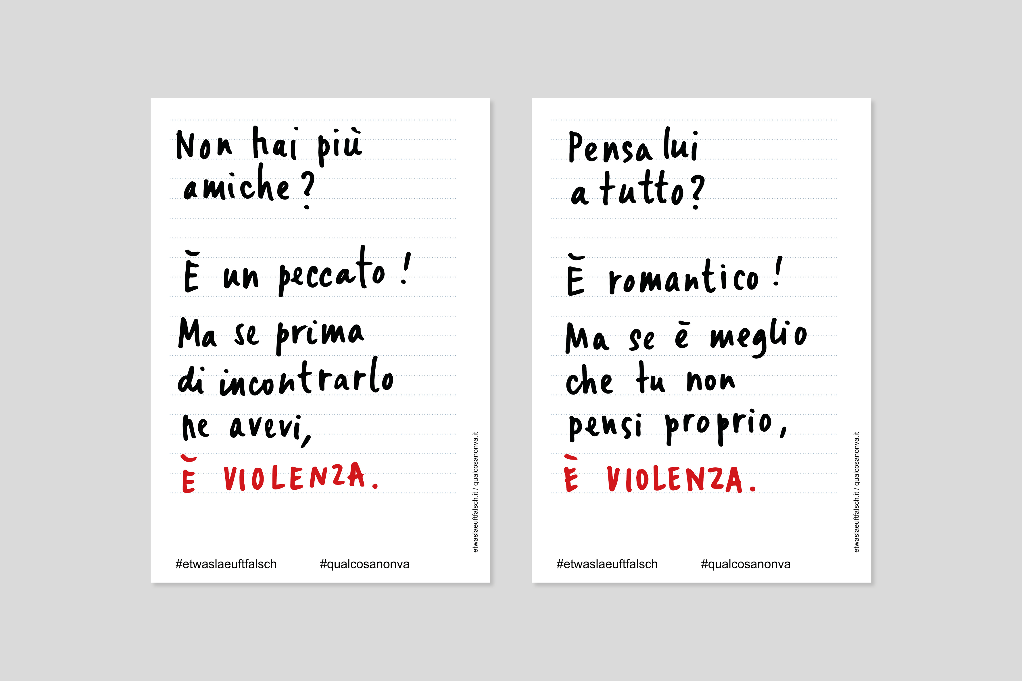 Il maltrattamento fisico non è l’unica modalità attraverso cui si manifesta la violenza, ma è solamente la forma più visibile che distoglie dal riconoscere innumerevoli altri sintomi di danno psichico. La violenza tra coniugi spesso è mascherata da abitudini apparentemente innocenti, in realtà finalizzate a controllare le donne, limitarne la capacità di agire minando sistematicamente la loro autostima, isolandole dai sistemi di supporto e promuovendo una dipendenza tossica, sia sul piano finanziario che su quello emotivo. Incolpiamo e mettiamo in discussione donne che non riescono a lasciare partner violenti, rendendoci conto raramente dei motivi per cui sono costrette a restare. Questa serie di manifesti vuole porre l’attenzione su diversi segnali d’allarme di una violenza domestica, che spesso vengono ignorati perché non li riconosciamo come riconducibili a un abuso, soprattutto quando vediamo la violenza come un’estensione dell’amore.