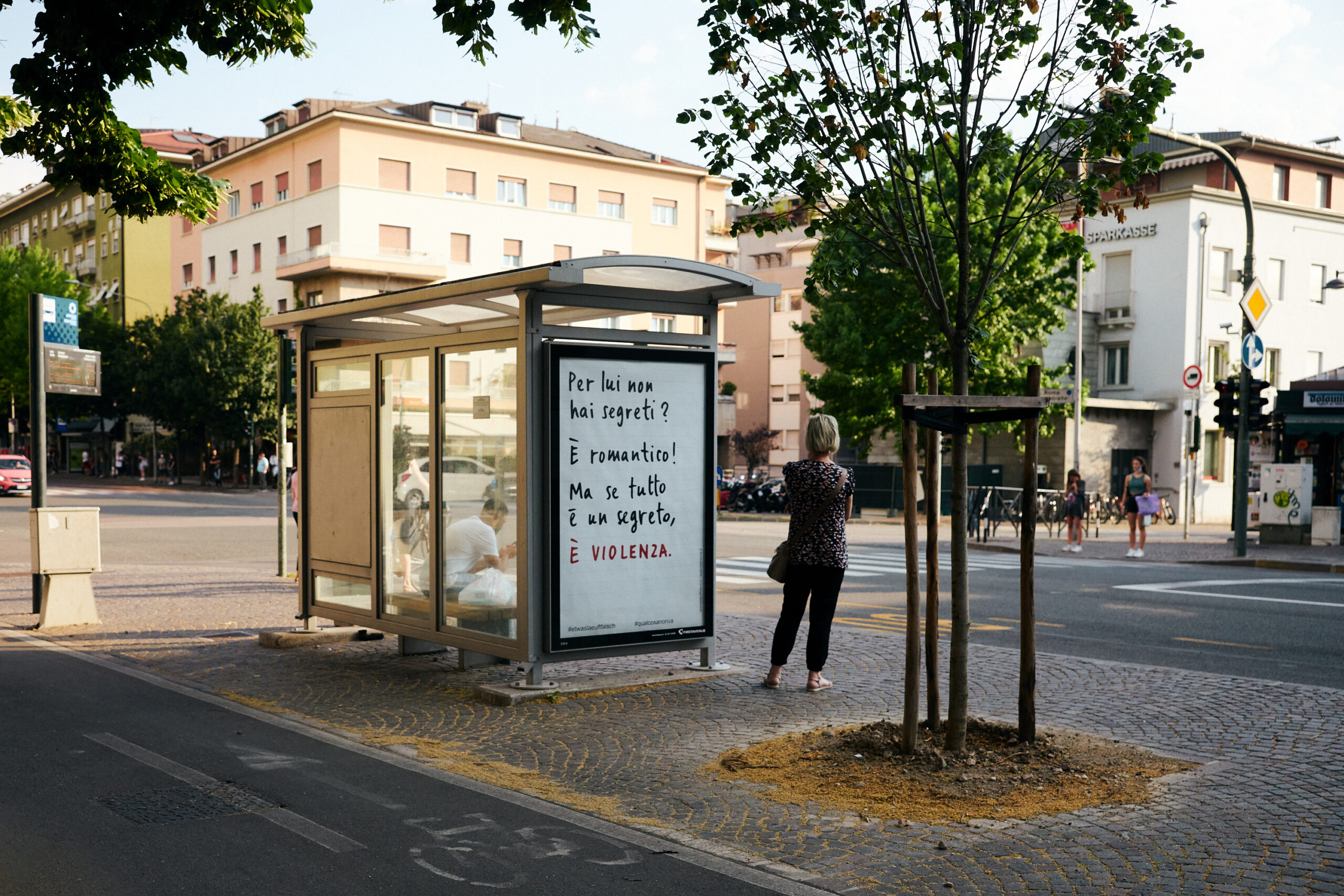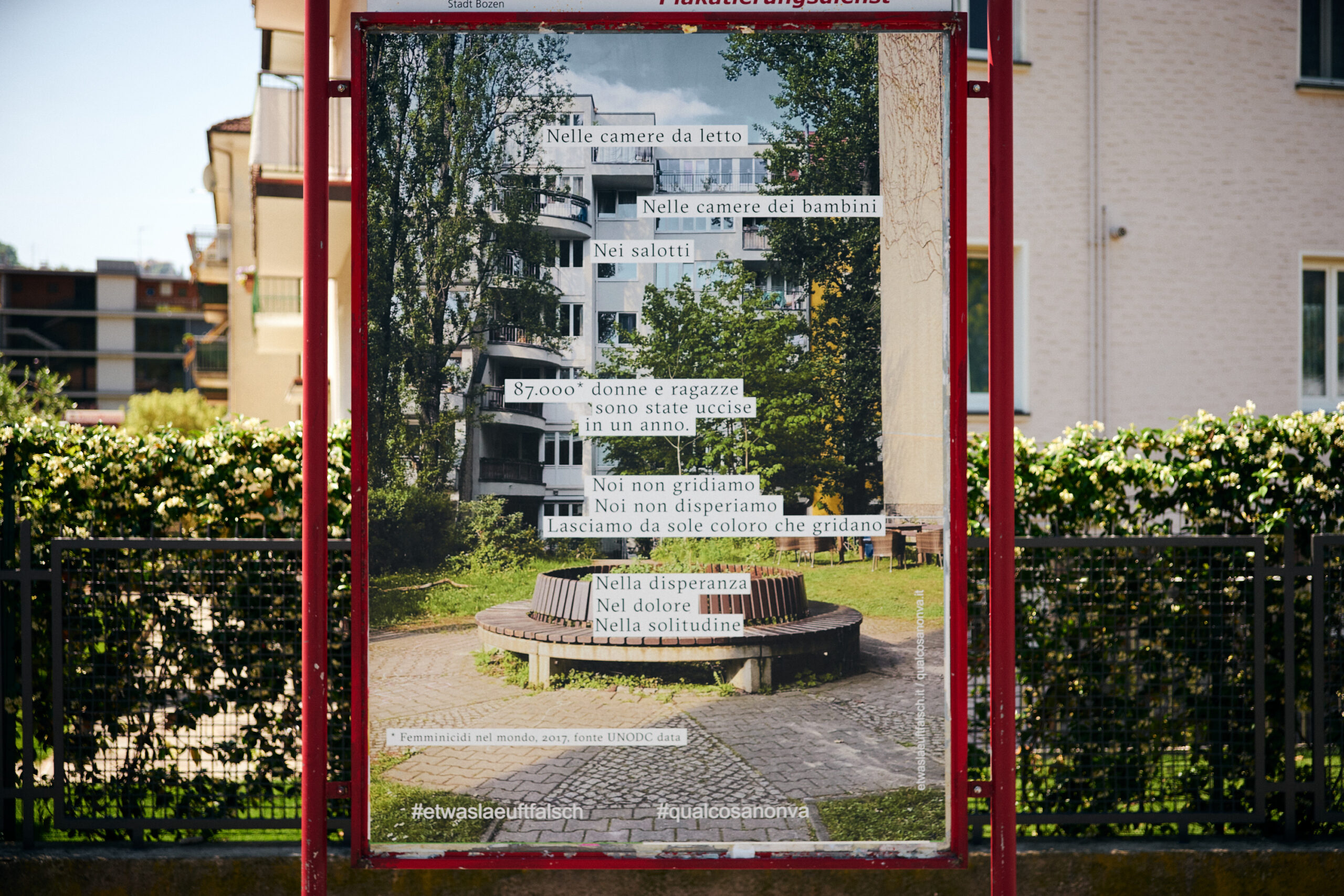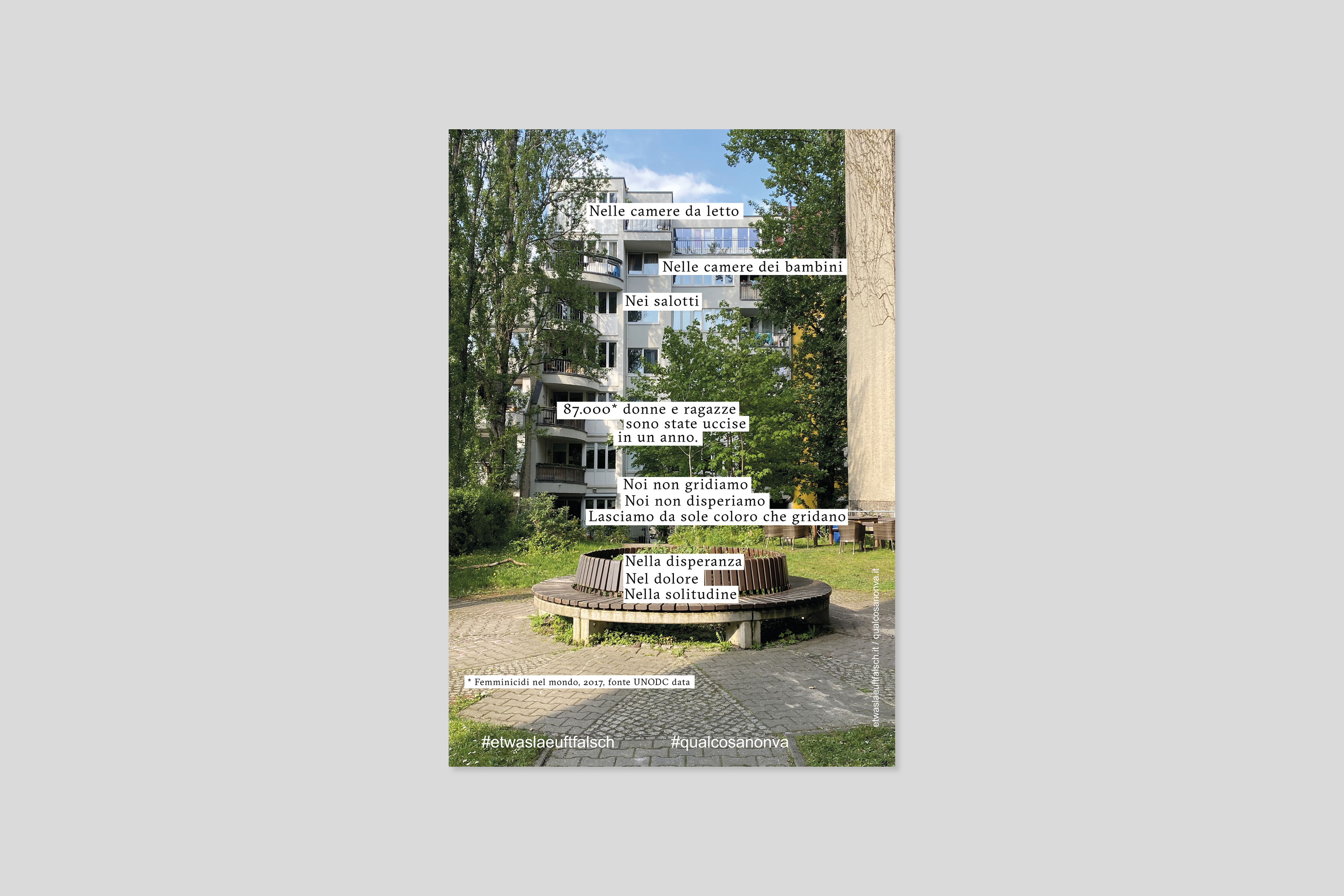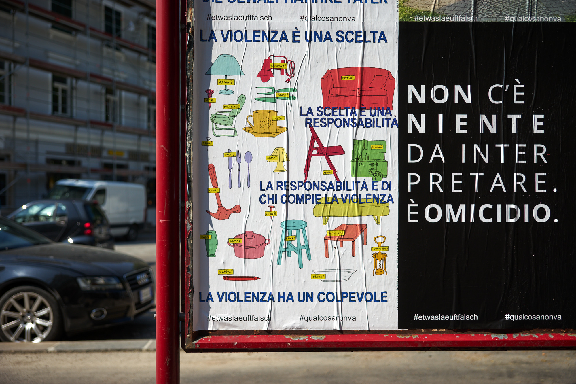 Il maltrattamento fisico non è l’unica modalità attraverso cui si manifesta la violenza, ma è solamente la forma più visibile che distoglie dal riconoscere innumerevoli altri sintomi di danno psichico. La violenza tra coniugi spesso è mascherata da abitudini apparentemente innocenti, in realtà finalizzate a controllare le donne, limitarne la capacità di agire minando sistematicamente la loro autostima, isolandole dai sistemi di supporto e promuovendo una dipendenza tossica, sia sul piano finanziario che su quello emotivo. Incolpiamo e mettiamo in discussione donne che non riescono a lasciare partner violenti, rendendoci conto raramente dei motivi per cui sono costrette a restare. Questa serie di manifesti vuole porre l’attenzione su diversi segnali d’allarme di una violenza domestica, che spesso vengono ignorati perché non li riconosciamo come riconducibili a un abuso, soprattutto quando vediamo la violenza come un’estensione dell’amore.