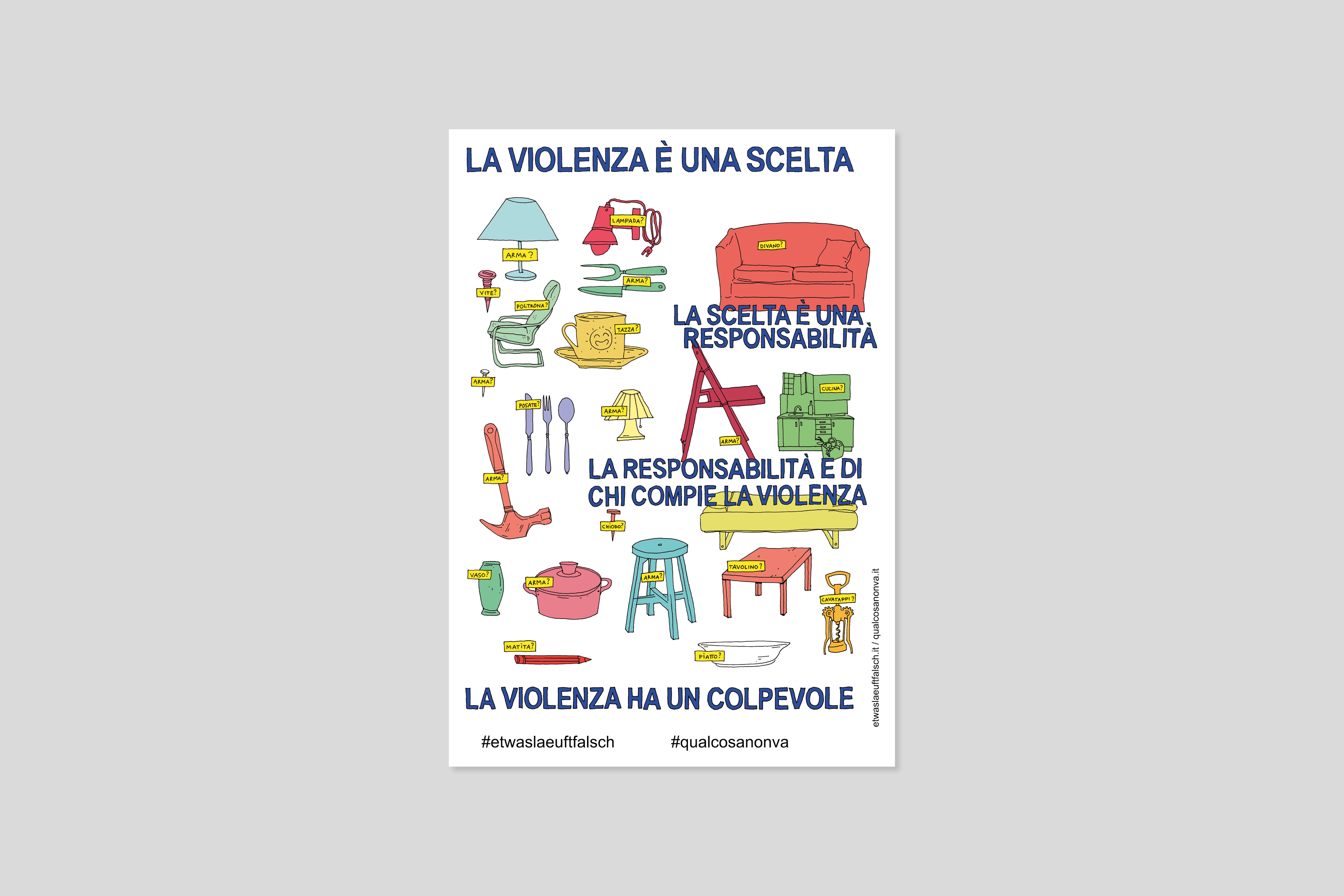 Quando andiamo a comprare oggetti e materiali per arredare la nostra casa, forse non siamo ancora pronte a immaginarci che anche una tazza possa trasformarsi in un’arma contro di noi. La violenza domestica impiega le energie più creative e le scuse più assurde per legittimarsi: raptus, gelosia, disobbedienza, tradimento, litigio. Gli oggetti nelle case sono spesso gli unici testimoni della violenza sistemica patriarcale che agisce nel privato nella sua ferocia più incontrollabile. È importante riconoscere che la violenza è una scelta, non una conseguenza, e che chi compie questa scelta ne è responsabile. Tra gli ostacoli più difficili da superare per coloro che sono sopravvissute c’è sicuramente il senso di colpa per aver denunciato una violenza fisica, psicologica e/o emotiva o per essersi ribellate ad essa. Il manifesto intende mostrare la violenza nella sua brutale normalità.